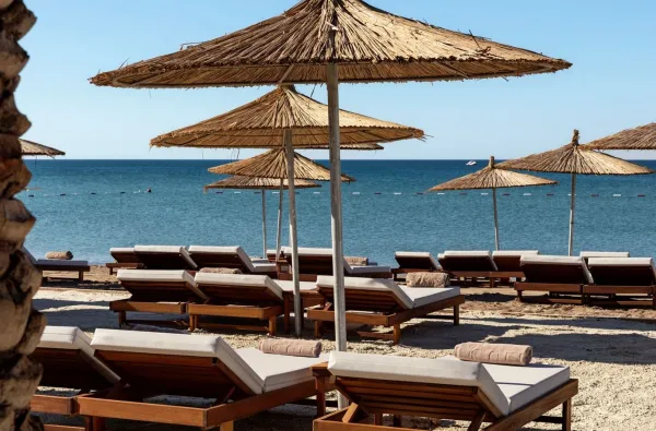 Išskirtinis paplūdimys. 800 metrų ilgio balto smėlio pakrantė su prabangiais pirsais ir stilingais barais.
