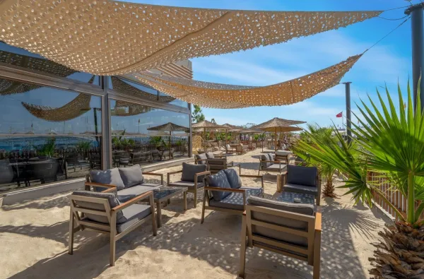 Viešbutis turi platų, nuosavą smėlio paplūdimį su nedideliu žvirgždu ties vandens linija, todėl vanduo išlieka skaidrus. Įspūdinga medinė prieplauka (tiltas) turi savo barą ir patogius gultus, leidžiančius mėgautis jūra be tiesioginio kontakto su smėliu. Paplūdimys yra saugus, su nuolatos budinčiais gelbėtojais ir gausybe skėčių nuo saulės. Už papildomą mokestį galima išsinuomoti prabangias VIP pavėsines.