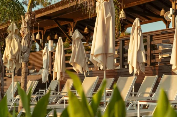 Viešbutis turi nuosavą žvyro paplūdimį su įrengta prieplauka (pontono tiltu). Paplūdimyje yra nemokami gultai, skėčiai ir rankšluosčiai. Dėl žvyro paplūdimys yra tvarkingas, tačiau įėjimas į jūrą nuo kranto gali būti nepatogus be specialios avalynės. Dauguma svečių renkasi maudytis nuo prieplaukos. Paplūdimio baras ir DJ pasirodymai užtikrina gyvą ir linksmą atmosferą prie jūros.