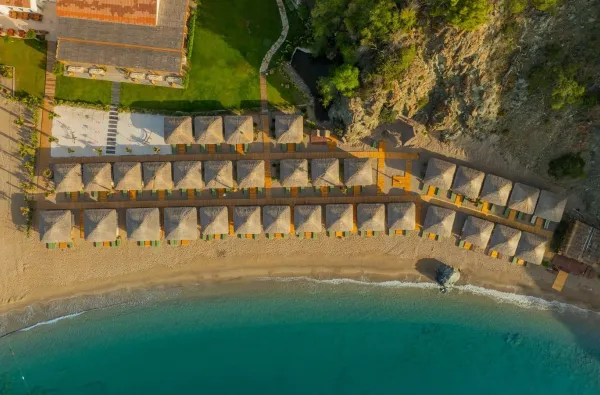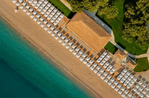 Paplūdimys yra platus, nusėtas smulkiu žvirgždu ir smėliu, o vanduo čia išskirtinai skaidrus dėl akmenuoto dugno. Įrengta didelė ir patogi medinė prieplauka su gultais ir baru, iš kurios patogu šokti į vandenį. Paplūdimio zonoje yra specialios „Cabanas“ (pavėsinės) su asmeniniu aptarnavimu tiems, kurie vertina privatumą. Švara paplūdimyje palaikoma nuolat, o gelbėtojai užtikrina saugumą visą dieną.
