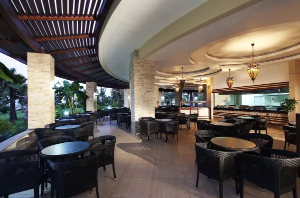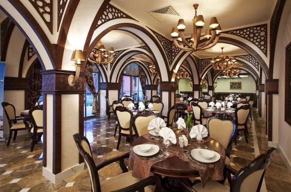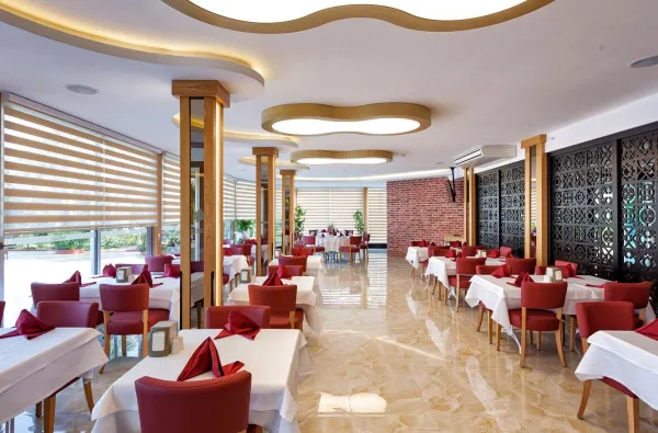 Viešbutyje veikia pagrindinis restoranas bei keli à la carte restoranai (osmanų ir italų virtuvės), kuriuose būtina išankstinė rezervacija. „Viskas įskaičiuota“ sistema siūlo gausų švediško stalo pasirinkimą, kur dominuoja turkiški skoniai, šviežios daržovės, vaisiai ir gausybė saldumynų. Paplūdimio ir baseino barai dienos metu tiekia užkandžius, picas bei tradicinius turkiškus blynelius – gözleme.