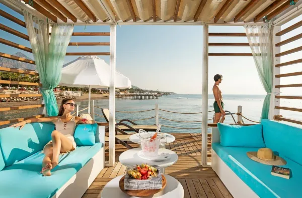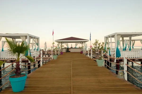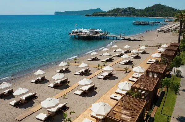 Viešbutis turi ilgą privatų smėlio ir žvirgždo paplūdimį, kuriam suteiktas Mėlynosios vėliavos sertifikatas už švarą ir tvarką. Įėjimas į jūrą yra akmenuotas (kaip ir visame Kemero regione), todėl jautresniems žmonėms rekomenduojama speciali avalynė. Paplūdimyje yra didelis pirsas su deginimosi zonomis ir baru, taip pat daugybė gultų po tentais, apsaugančiais nuo saulės.