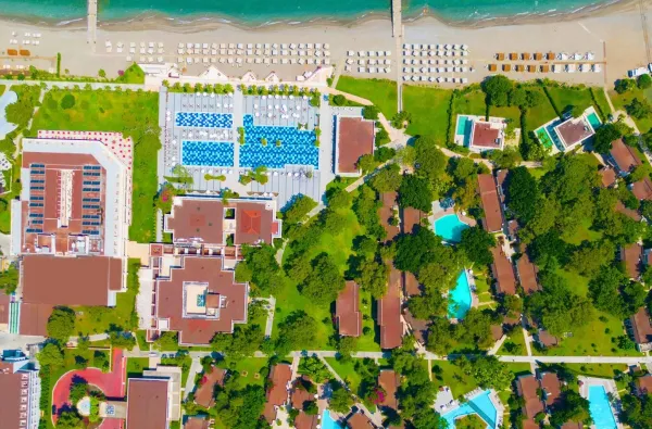 Tai didelis, horizontaliai išsidėstęs kompleksas, kurį sudaro 45 dviejų ir trijų aukštų nameliai, harmoningai įsilieję į pušyną. Sezono metu viešbutyje ilsisi daug svečių, tačiau dėl protingo išplanavimo ir didžiulės erdvės, žmonių srautai pasiskirsto – vieni renkasi aktyvią zoną prie pagrindinio baseino, kiti ieško ramybės atokesniuose sodo kampeliuose. Atmosfera čia demokratiška ir laisva: dieną verda aktyvus gyvenimas vandens parke, o vakarais šurmulys persikelia į pramogų aikštę, tačiau ramybės ieškotojai visada ras tylų kampelį.